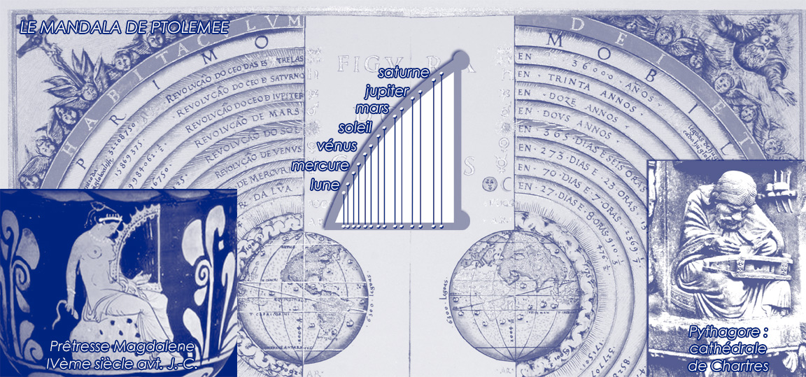 Le mandala de Ptolémée emprunte à Pythagore les vitesses de rotation des différentes planètes autour de la Terre. Le soleil est ici considéré comme une planète. La Lune est la plus rapide, ensuite viennent par ordre de vitesse décroissante : Mercure, Vénus, Soleil, Mars, Jupiter et Saturne. Chaque planète dans sa révolution génère une bande de fréquence. Or, si l’on représente toutes ces bandes planétaires, on obtient par couches successives la totalité des bandes qui composent notre voûte céleste jusqu’à l’étoile polaire. Ainsi s’établit l’ordre mathématique vibratoire subtil du cosmos imprégnant la Terre et les hommes.