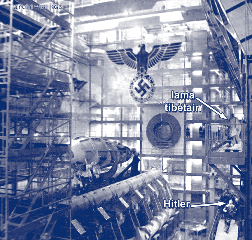 Cette photo déclassifiée, montre Hitler (en bas à droite) inaugurant une usine d’armement secrète. Alors que toutes les issues sont gardées par des hommes en armes, on peut voir sur la passerelle supérieure un lama tibétain se promenant librement. Cela démontre que le Tibet eut une responsabilité dans la création d’armes novatrices nazies. Fort de connaissances en armes traditionnelles psychotroniques et en armes volantes telles que les Vimana de l’ère védique, les lamas tibétains aidèrent les nazis pour l’effort de guerre. F.M.